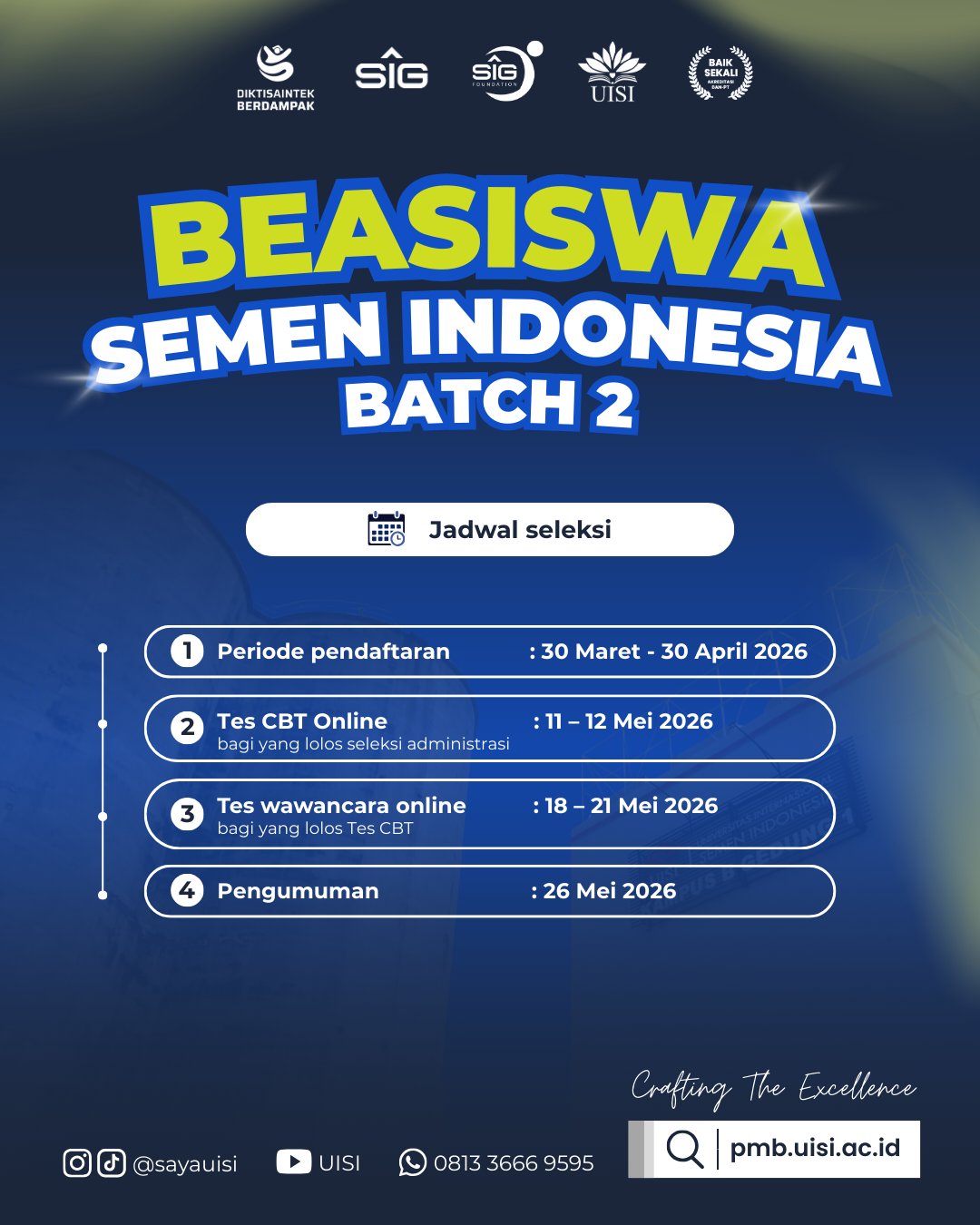 Beasiswa Semen Indonesia Batch 2 merupakan beasiswa penuh dengan benefit bebas biaya kuliah 100%* (*BIP dan UKT) selama maksimal 8 semester. Bagi kamu yang punya prestasi akademik, non akademik atau tahfidz dan pengen kuliah gratis sampai lulus, bisa daftar melalui jalur ini. Syaratnya apa saja, simak berikut :