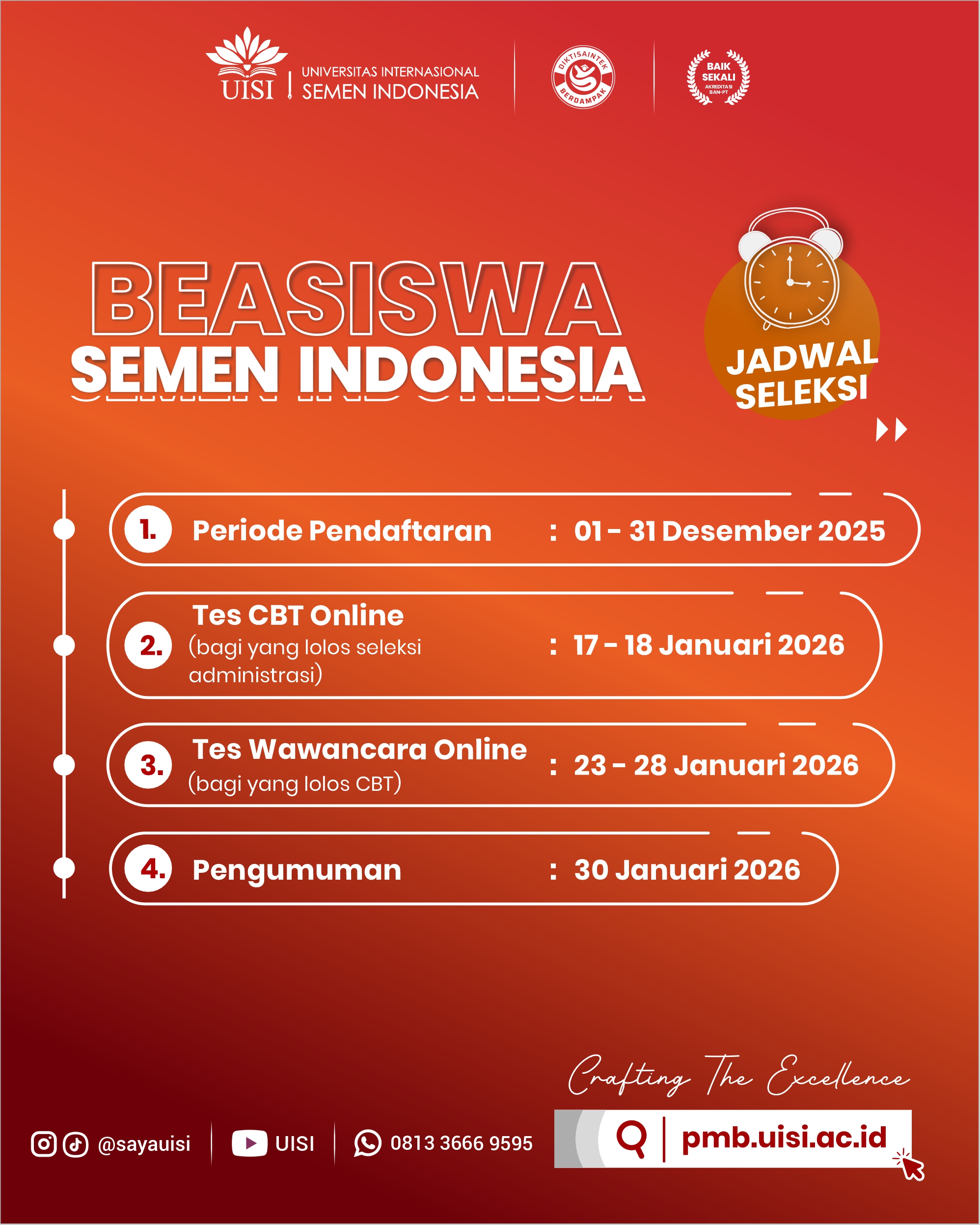 Beasiswa Semen Indonesia merupakan beasiswa penuh dengan benefit bebas biaya kuliah 100%* (*BIP dan UKT) selama maksimal 8 semester. Bagi kamu yang punya prestasi akademik, non akademik atau tahfidz dan pengen kuliah gratis sampai lulus, bisa daftar melalui jalur ini. Syaratnya apa saja, simak berikut :