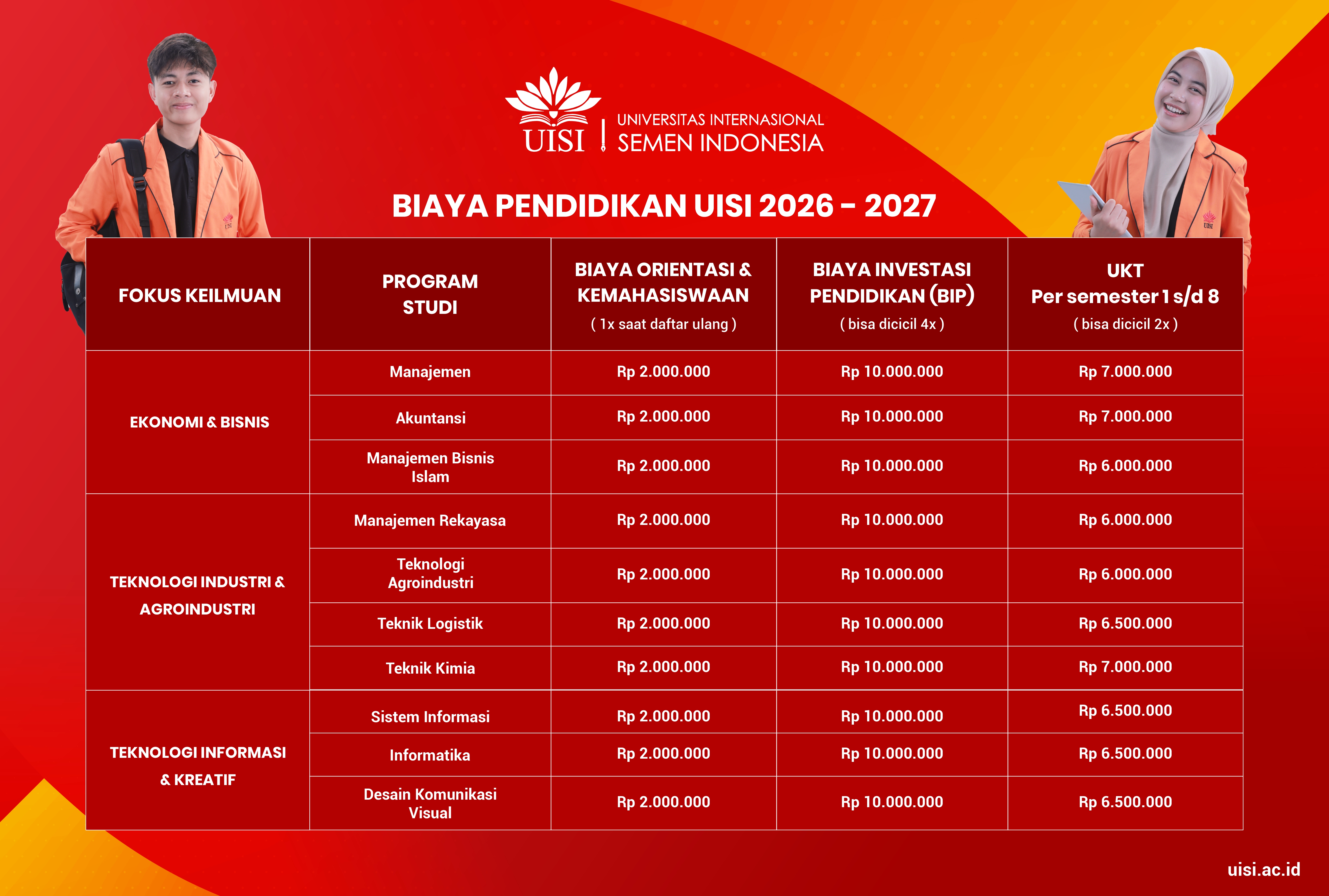 Biaya pendidikan Program Sarjana UISI terdiri dari 3 komponen, yaitu :